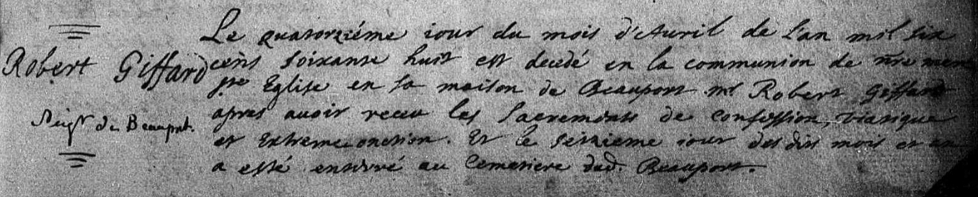 Cinq ans plus tard, le 14 avril 1668, Robert Giffard meurt en son manoir de Beauport à l’âge présumé de 81 ans. Il est inhumé deux jours plus tard au cimetière de Beauport. Le nom de Giffard ne perdurera pas en Nouvelle-France : ses filles seules transmettront son sang aux générations suivantes.